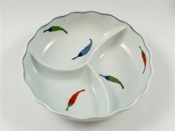 有田焼HOME鉢 多用鉢・預け鉢・中鉢 三つ仕切りになっていますので、料理・漬物・おつまみ等を小分けしてご利用いただけます。 錦三色こしょう 三品盛(大) 価格: ¥4,620 (税込) [ポイント還元 46ポイント~] 販売期間: 数量: 個 在庫 在庫あり 返品についての詳細はこちら サイズ 直径19cm×高さ5.1cm 材 質 磁器 梱 包 化粧箱入 電子レンジ 可