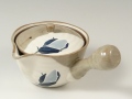 バランスのいい独特な取っ手で、粉引(白化粧)の上に青のもくれんを、バランスよく描かれています。