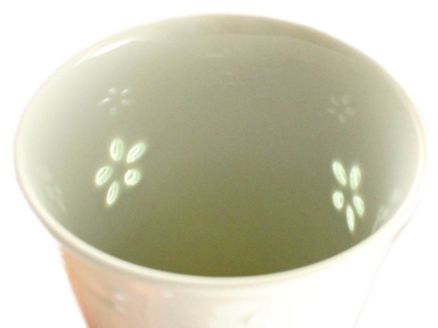 一珍技法で桜の輪郭と花びらを盛り上げ、生地に桜の花びらの形の穴を空け、その中にホタル釉を流し込んで焼成したビアカップです。