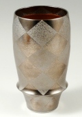 プレミアムビアグラスの外は菱紋で、技法の異なるプラチナ彩を描き、内は金彩を施した、錦右エ門窯の豪華な渾身の自信作です。