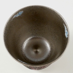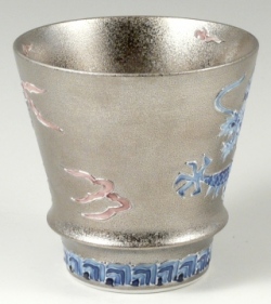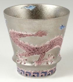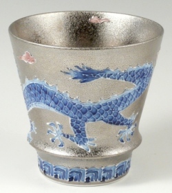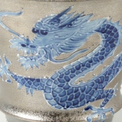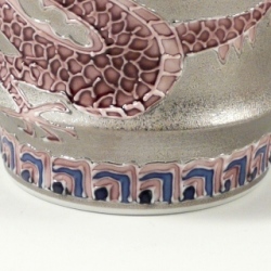 天空に昇り飛翔する龍を、丁寧かつ大胆な一珍技法で盛り上げ、内外に贅沢にプラチナ彩を施した錦右エ門窯の逸品です。