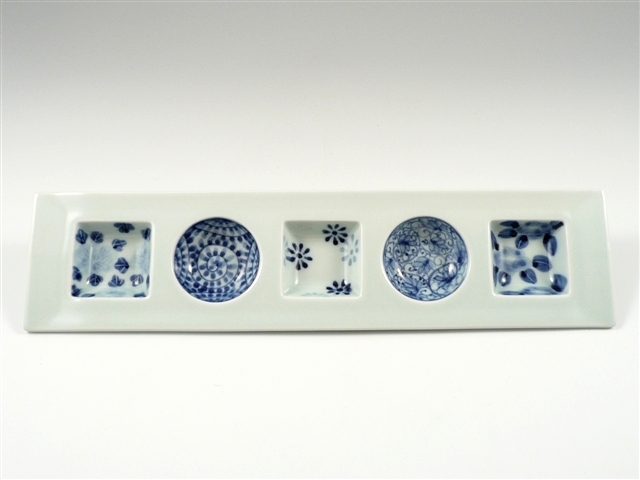 染付五柄紋様〇□ 5品盛