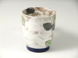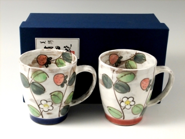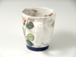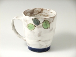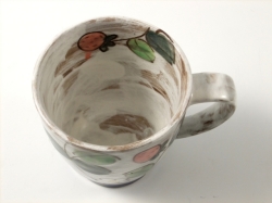 <長十郎窯>粉引(白化粧)をかけ、内外に野苺を描いた、独特な感覚のマグカップです。