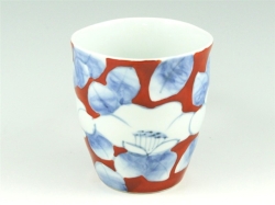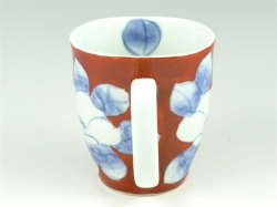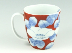 有田焼伝統の染錦(下絵と上絵)の絵柄で、椿柄を丁寧に描いた持ちやすいハンドルのマグカップです。