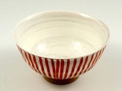 陶器(土もの)に粉引(白化粧)をかけ本窯焼成して、十草を描き赤絵焼成して仕上げています。