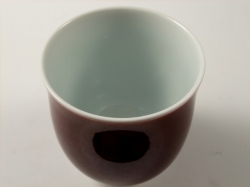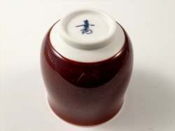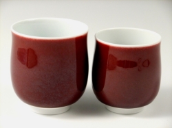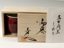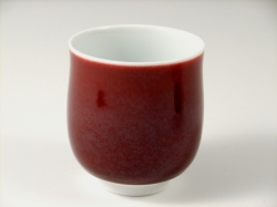 辰砂は釉薬の調合や火の強弱、窯の状態などの状態により微妙に色合いが変化する大変難しい釉であり、馬場真右エ門(日展作家)の代表的な深い味わいの釉です。それは釉薬に含まれる銅が還元焼成して、美しい赤を発色します。